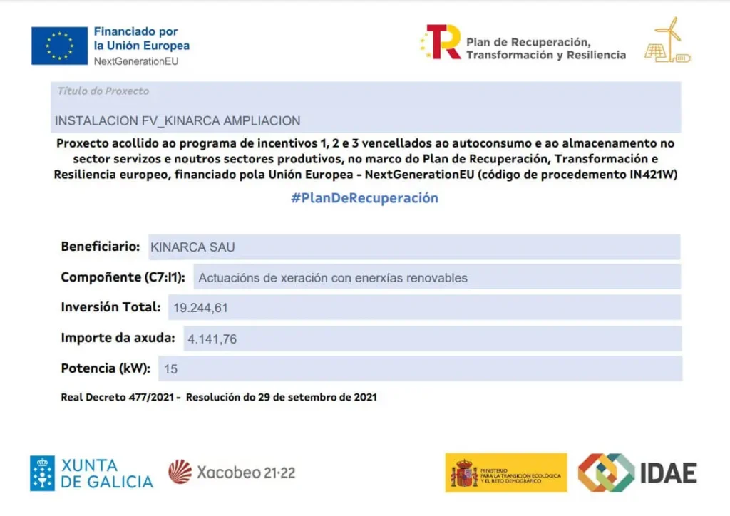 KINARCA, S.A.U. has been a beneficiary of European Funds aimed at fostering sustainable growth and competitiveness of SMEs. Thanks to this, it has implemented an International Digital Marketing Plan to improve its online positioning in foreign markets during 2024. For this purpose, it has received support from the XPANDE DIGITAL Program of the Chamber of Commerce of Pontevedra, Vigo, and Vilagarcía de Arousa.